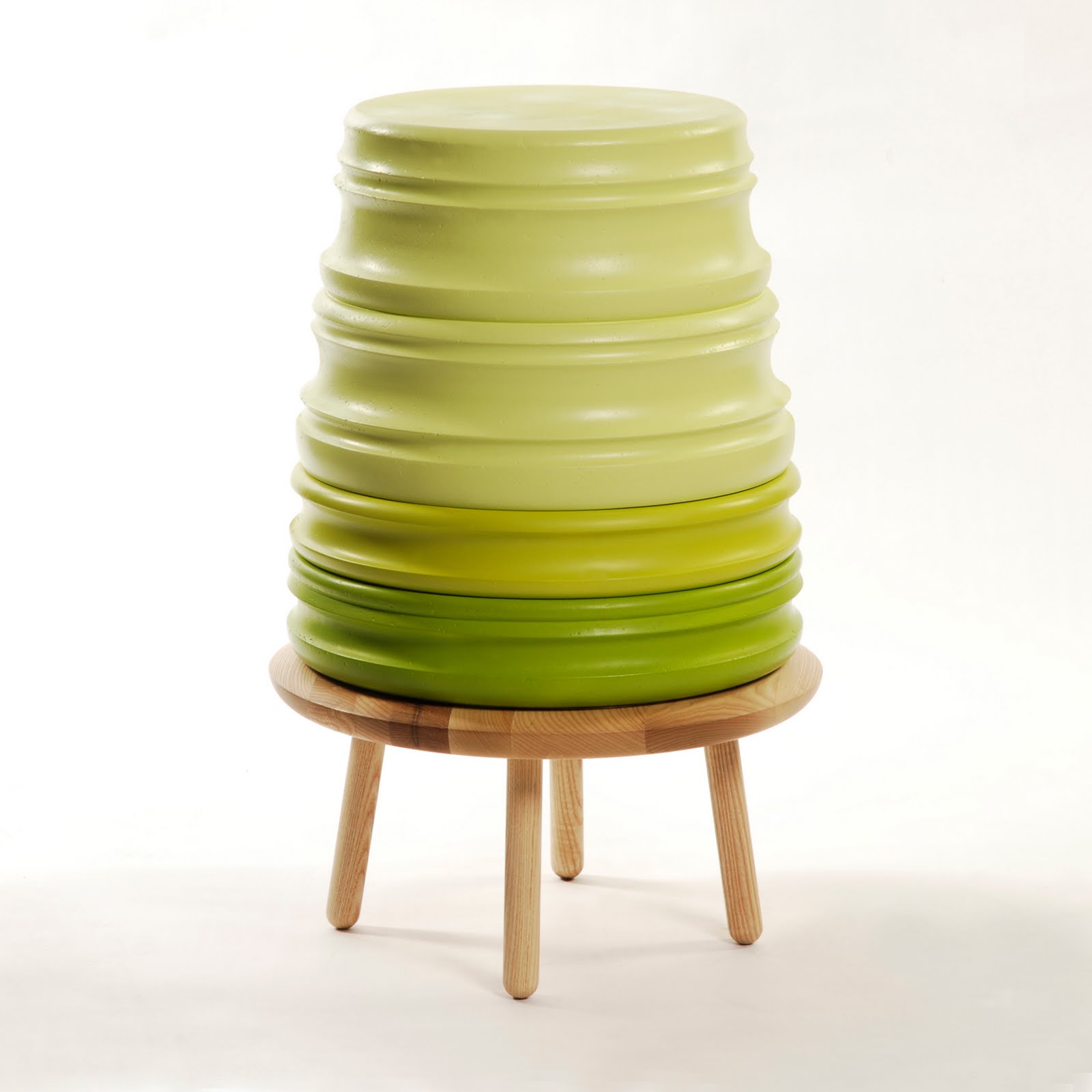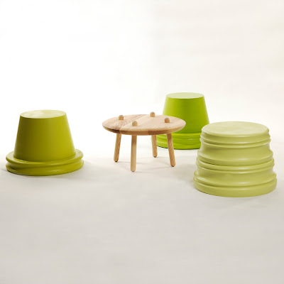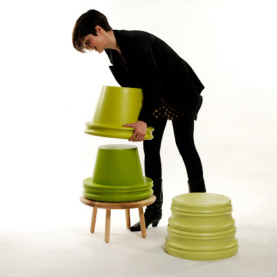 Tuffet Stacking stool and table set. The very first prototype to be launched at Milan 2010. The stools are made from sawdust and resin, from a process in its infancy developed by Turners and Moore and Purewhyte. The Sawdust and resin mix is molded under high pressure and heat. The resulting material can then be worked and finished like timber. This process uses a material that would usually be thrown away; using a mould also means a larger shape can be made with less wastage in comparison to solid timber. The complete set of three stools and a small table can be stacked away and also used as a side table. Prototype. Dims: Stacked set- H837 x Dia 469 East stool – H356
